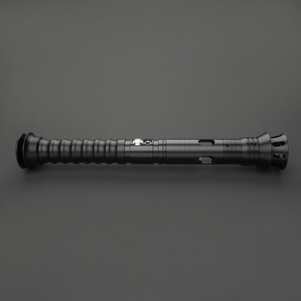 The Katanex Lightsaber is a sleek and battle-ready weapon, designed for duelists who prefer a streamlined and aggressive combat style. Available in black and silver, this saber features a long, ridged grip for enhanced control and stability, making it ideal for swift and precise strikes. The vented emitter and circular cutouts along the hilt give it a futuristic and menacing appearance, setting it apart from traditional designs. The flared pommel adds balance, ensuring seamless handling during combat.