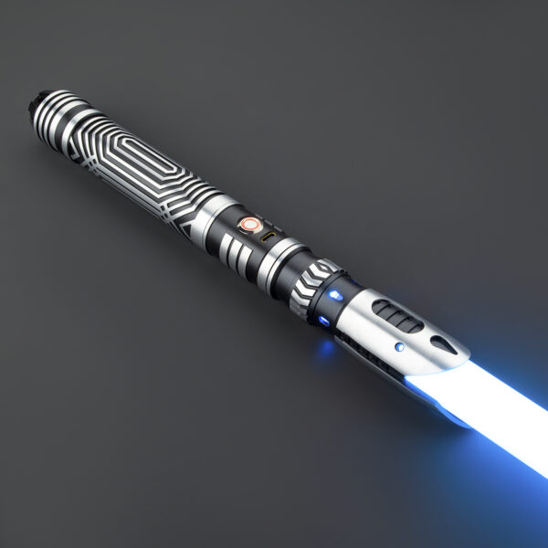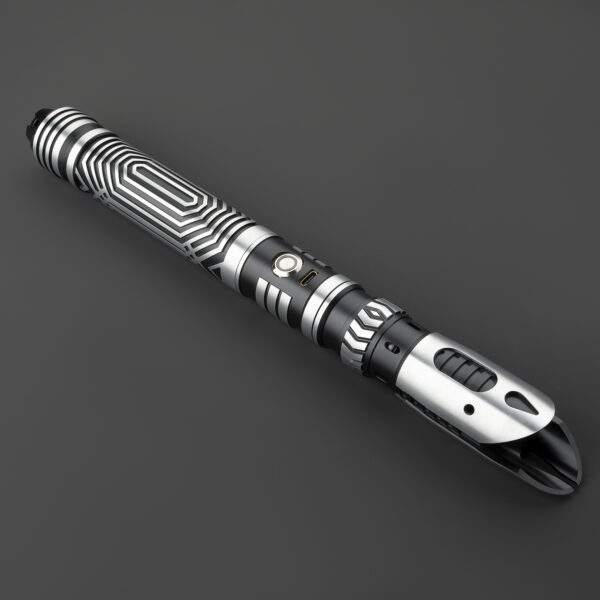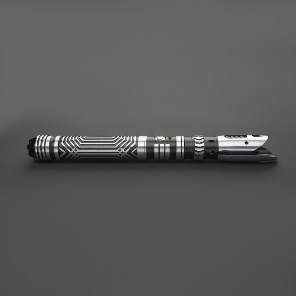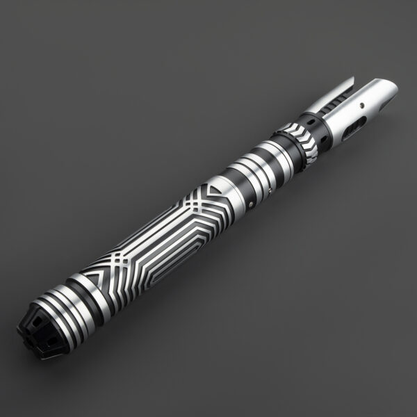The Matrix Lightsaber is a sleek and futuristic weapon designed for both collectors and duelists. With its intricate geometric patterns engraved into the hilt, this saber exudes a digital-age aesthetic while maintaining the elegance of traditional lightsaber craftsmanship. The combination of black and silver tones gives it a striking, high-tech appearance, making it a standout piece in any collection. The hilt is ergonomically designed, providing a comfortable grip for extended use.