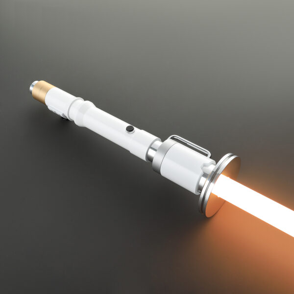 The Professor Huyang Duelling Lightsaber is a replica model inspired by the lightsabers designed under the guidance of the ancient droid, Professor Huyang. Known for his extensive knowledge of lightsaber construction, Huyang aided countless Jedi younglings in crafting their weapons over the centuries. This design reflects a refined and elegant aesthetic, featuring a white and gold hilt with a distinctive emitter reminiscent of the traditional Jedi craftsmanship.