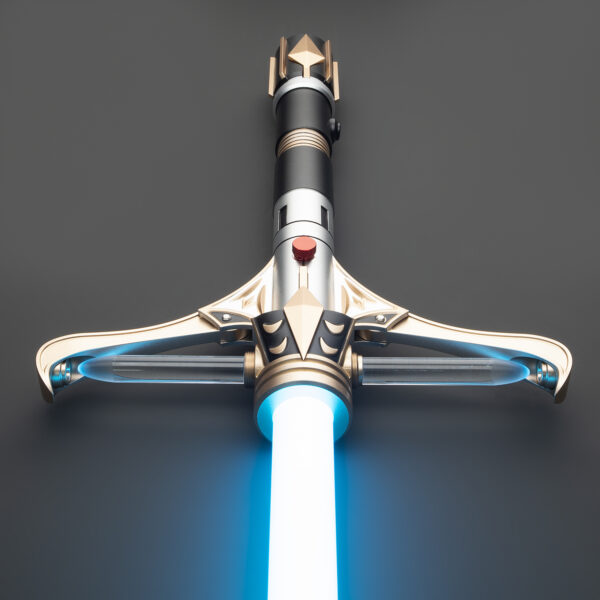 The Stellan Gios Lightsaber is a breathtaking replica of the weapon wielded by the esteemed Jedi Master in Star Wars: The High Republic. This saber features an intricate crossguard design with translucent energy vents, enhancing both its visual appeal and functionality. The hilt is a striking blend of silver, black, and gold, adorned with elegant geometric engravings that reflect the refinement and nobility of the Jedi Order. Its ergonomic grip ensures superior handling, while the regal emitter design solidifies its status as a masterpiece of Jedi craftsmanship.