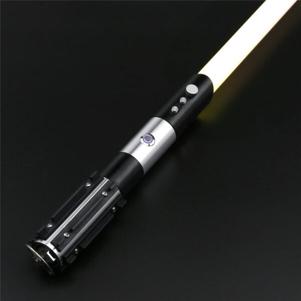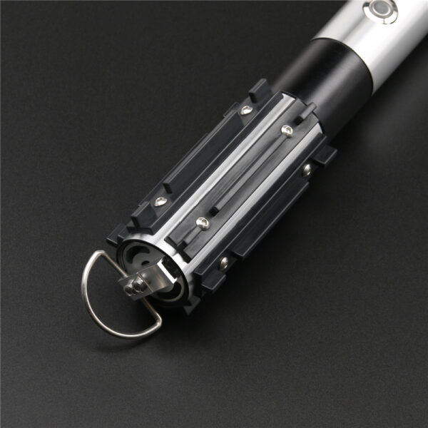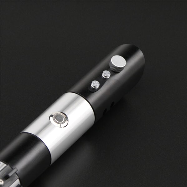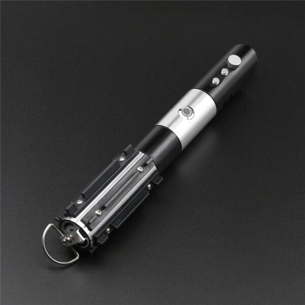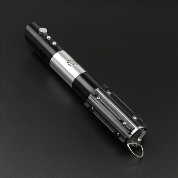 The Barrert Lightsaber combines timeless elegance with modern technology, making it the ultimate choice for both collectors and duelling enthusiasts. The hilt features a sleek black body accented with polished silver highlights, offering a refined and striking appearance. Its ergonomic design ensures a secure and comfortable grip, while the attachment ring at the base adds both practicality and authenticity.