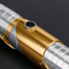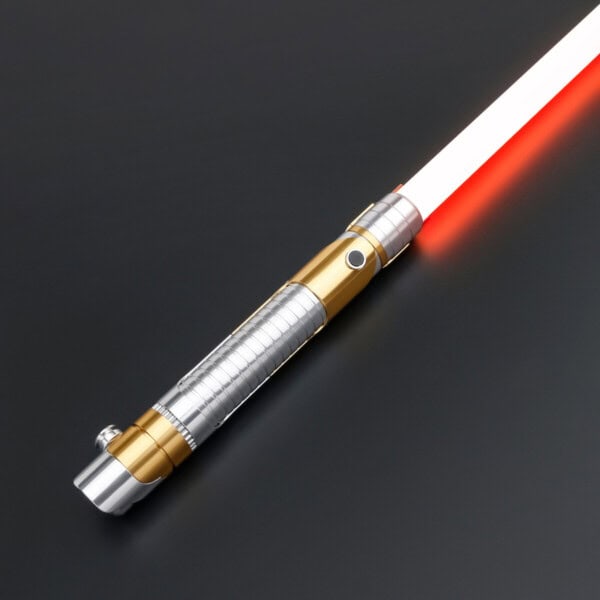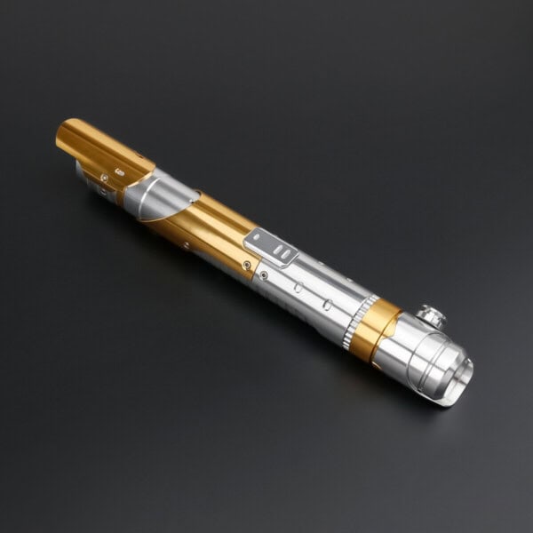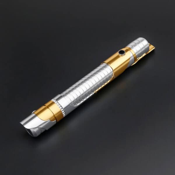 The Skeleton Crew SE Lightsaber is a meticulously crafted weapon inspired by the Star Wars: Skeleton Crew series. The hilt combines silver-polished aluminium with high-profile gold accents, creating an awe-inspiring visual impact. Carefully crafted grooves on the hilt enhance grip and provide a unique aesthetic, while the metal finish reflects light, making this lightsaber shine under various lighting conditions.
