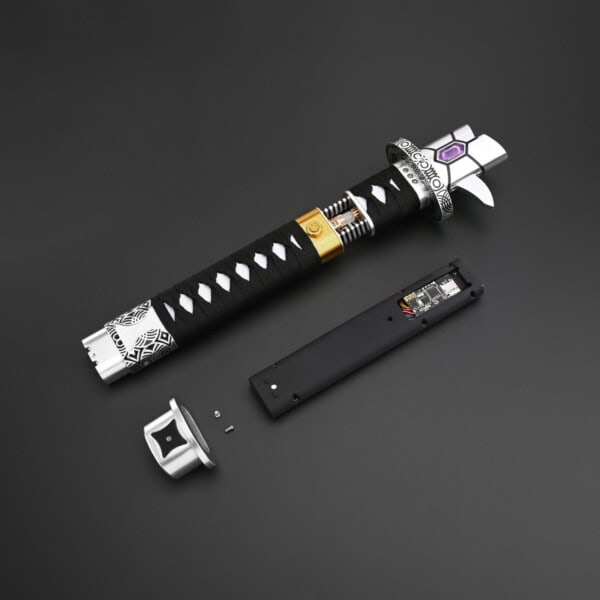 This one-of-a-kind saber blends the ancient design of a Katana with futuristic lightsaber aesthetics, resulting in a striking and ceremonial look. Its engraved, glowing blade, paired with a detailed tsuba-style emitter and wrapped hilt, creates a weapon that feels equally at home in the hands of a noble warrior or a Force-wielding shadow. The black and silver hilt is complemented by an elegant scabbard, giving it a distinctive presence whether worn or displayed.