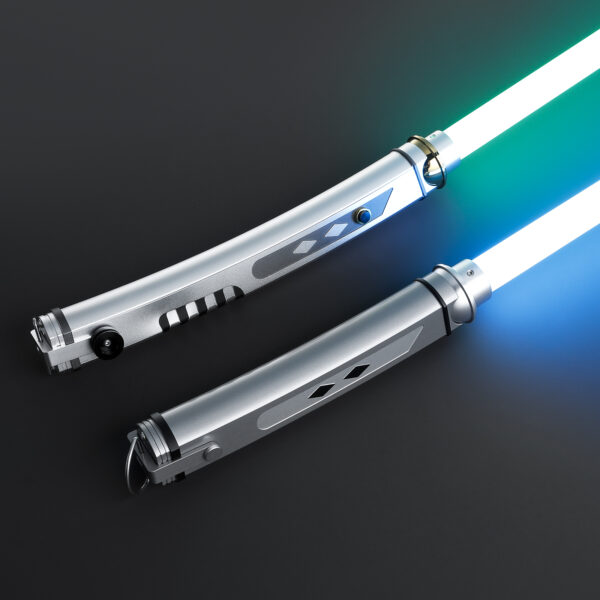 The Ahsoka Tano Rebellion Lightsabers are a faithful replica of the dual sabers wielded by Ahsoka during Star Wars: Rebels and the Ahsoka series. This set includes both her standard lightsaber and the shorter shoto saber, designed for her precise and acrobatic combat style. The hilts feature a sleek, curved design with a silver finish and dark inlays, capturing the refined, katana-like aesthetic seen on screen. The unique curvature enhances manoeuvrability, allowing for swift and fluid strikes. A ring attachment at the pommel further adds to their authenticity.