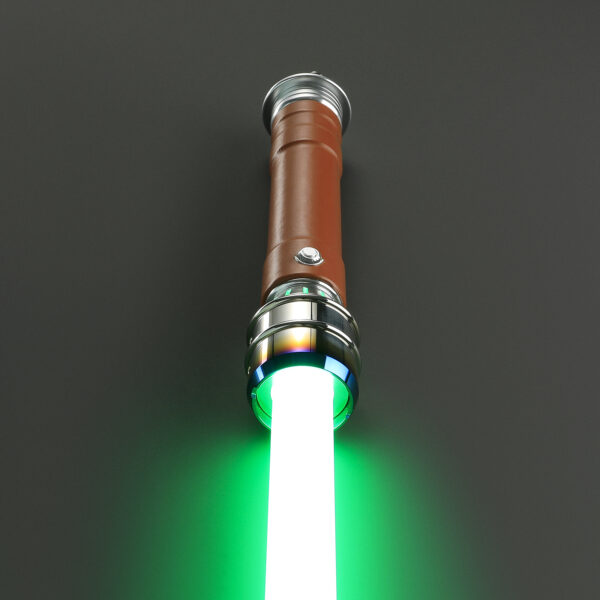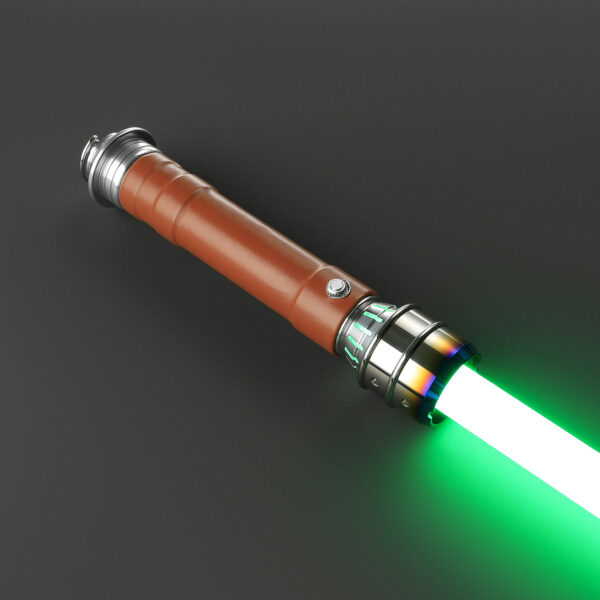 The Jecki Lightsaber is a beautifully crafted replica of the weapon wielded by Jecki Lon, the Padawan from Star Wars: The High Republic. This saber features a distinguished hilt wrapped in rich brown leather, offering a comfortable grip while exuding a traditional Jedi aesthetic. The emitter showcases a radiant silver finish with intricate vented detailing, adding both elegance and functionality to the design. The seamless integration of classic and modern elements makes this saber an essential piece for collectors and Jedi enthusiasts alike.