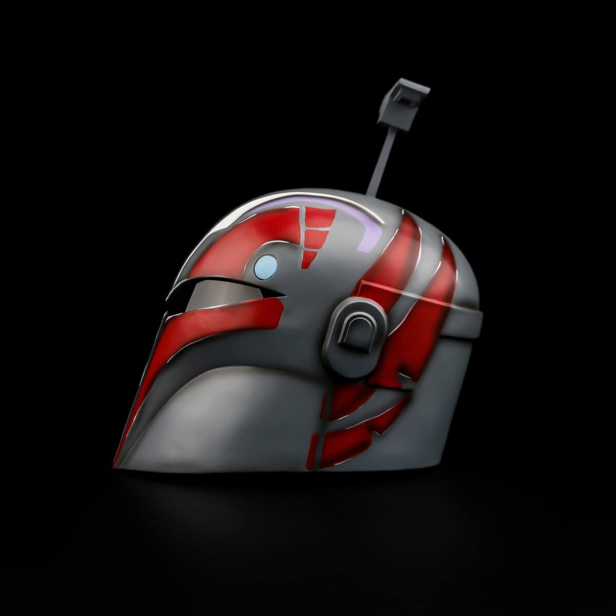 Worn by Sabine Wren, an artist, explosives expert, and freedom fighter, this helmet represents not just Mandalorian heritage but also individuality, defiance, and creativity. With its striking red, gray, and black color scheme, accented with custom artistic touches, it embodies Sabine’s fearless and expressive nature.